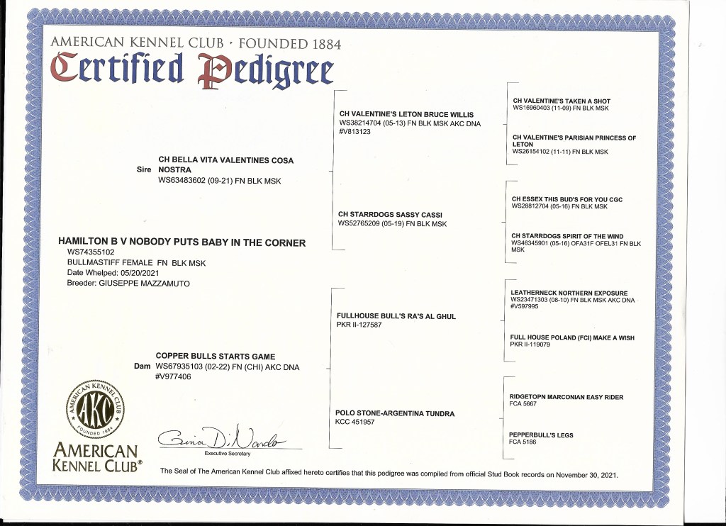 Queenie is from Bella Vita’s. Part of a decorated litter, with placements in 1st in class at Nationals by her sister Gabby, along with her other litter mates placing in shows.