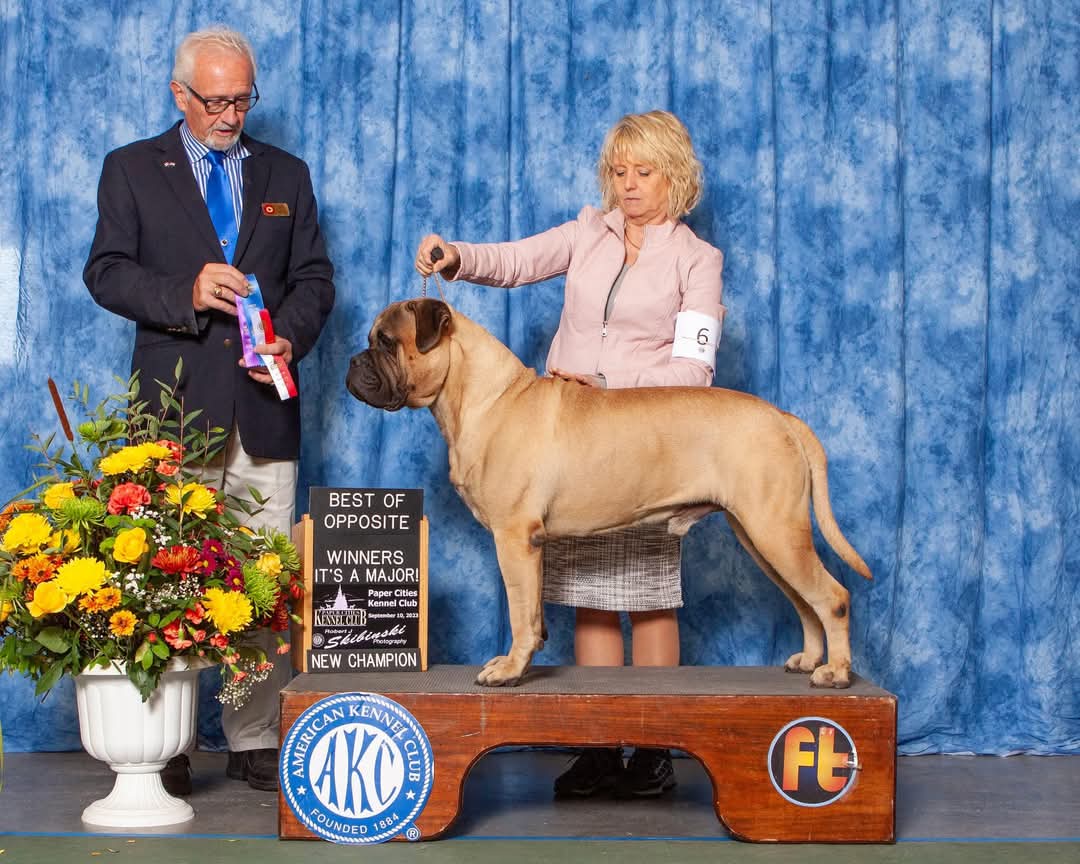 Gunner and Michelle Cramblett Baker win First Place and Winners at California Bullmastiff Fancier Independent Specialty in September ’23